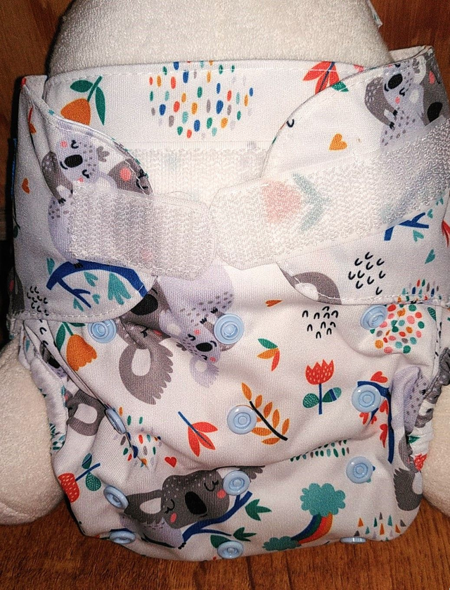 Les TE2 de Blümchen se composent d'un surpantalon imperméable à double gousset, avec 2 points d'attache Velcro à l'intérieur. Ce surpantalon est disponible dans différents imprimés et se ferme par velcro (ou par boutons pression sur commande). Des boutons pression sont présents sur le devant pour ajuster le surpantalon à la taille. Les surpantalons s'adaptent de 4 à 16 kilos.