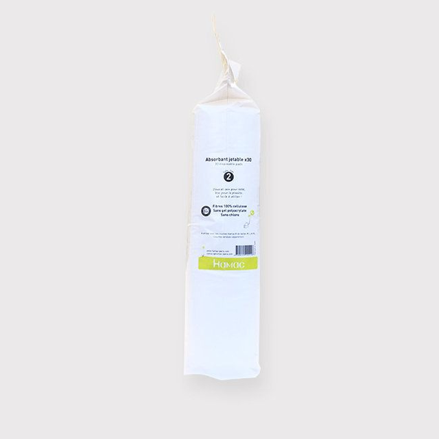30 absorbants jetables 100% cellulose à insérer dans la nacelle de la couche. Idéal en complément des absorbants lavables pour les déplacements, en balade, chez des amis...