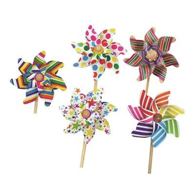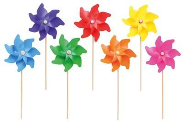 Moulins à vent de différentes tailles et coloris.
